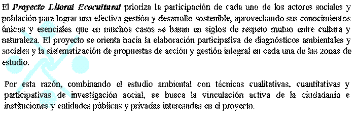 | Habida cuenta del carácter integral e interdisciplinar del Proyecto Litoral Ecocultural, el proceso de investigación con el que parte tiene diferentes momentos y mecanismos de actuación.